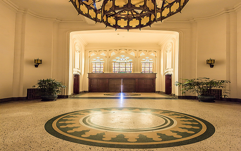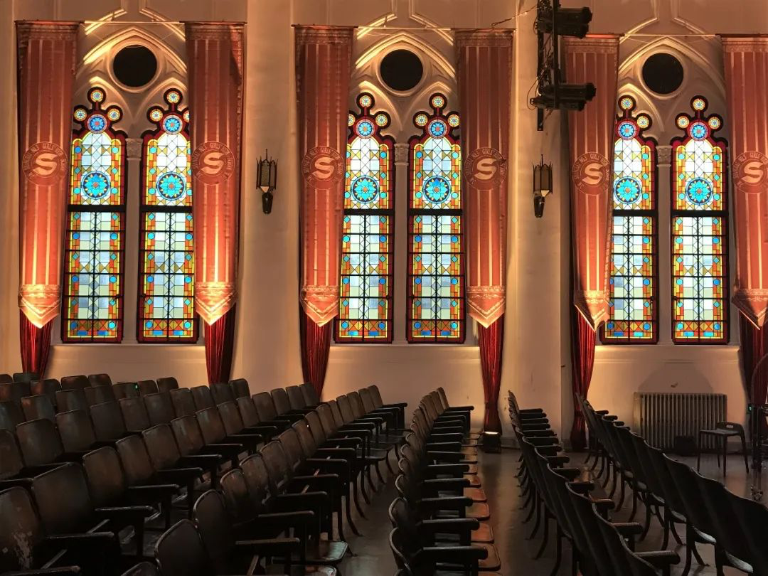 由门厅可直接进入首层大礼堂,礼堂内装有吊灯,正前方为舞台,礼堂两侧均为尖券式彩色玻璃窗。门厅的东西两侧为走廊,教室分布在走廊的南北两侧,每间教室采光充足。