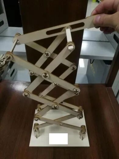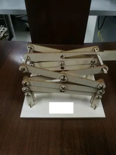 这个升降机,中间有连接轴了(铰链轴),可以立起来。交叉连杆在连接轴上没定位,会来回滑动,导致支撑不稳定,使上面的平台倾斜。